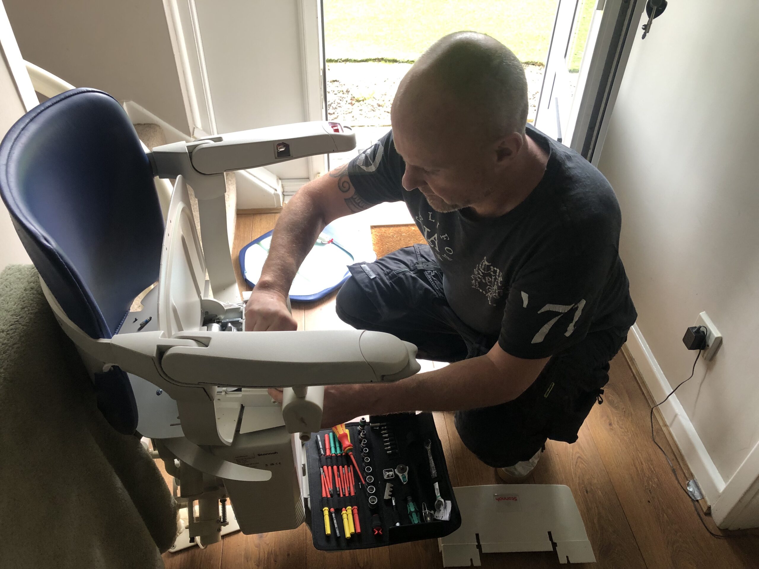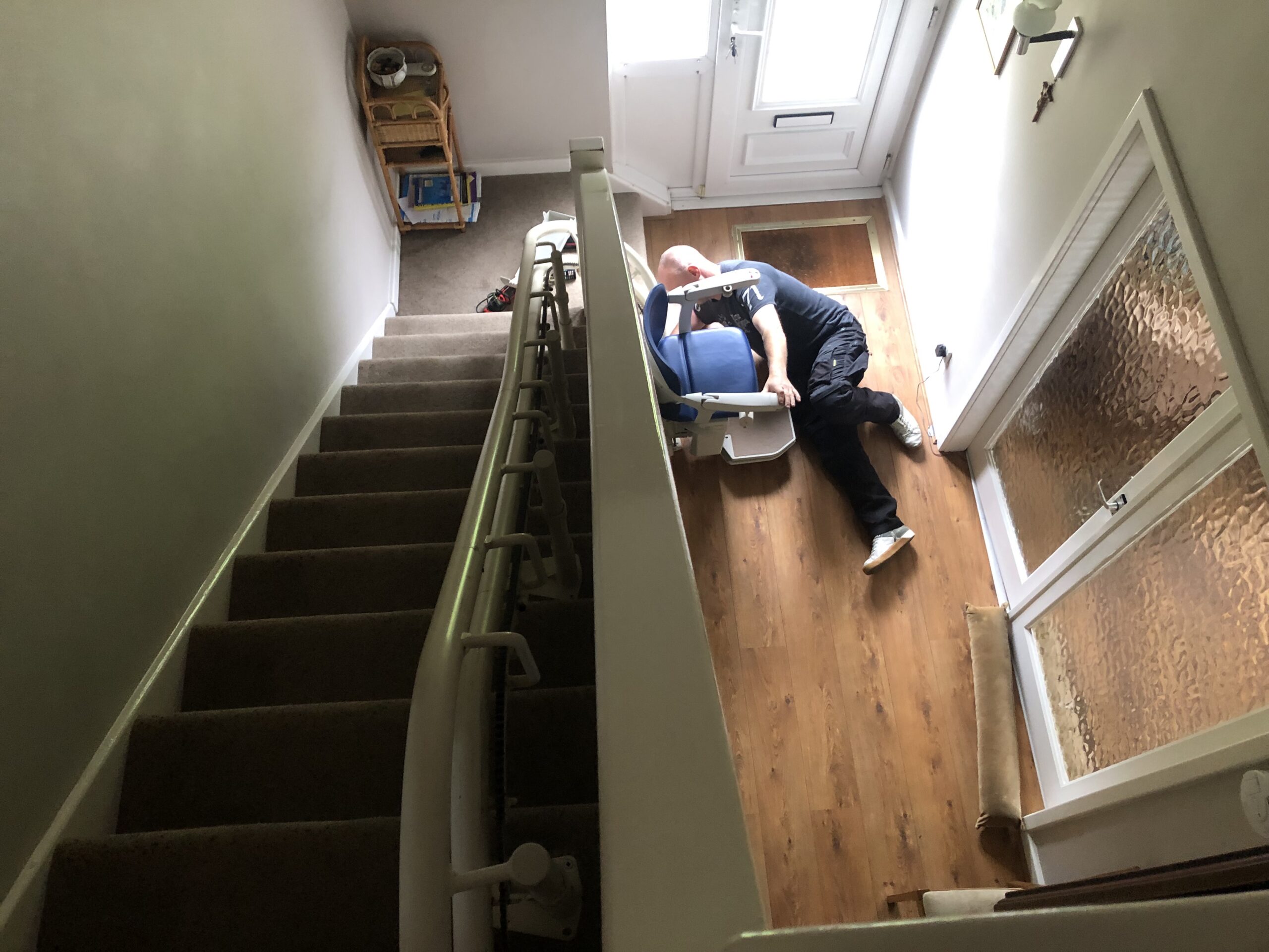 This stairlift issue was one of the stairlift having embedded into the staircase, causing the lift to catch at the top of the stairs. This sometimes can happen over time, where the lift drops slightly with use, lowering the position of the stairlift as it travels. There was also a minor electric issue with a switch on the arm, which was easily fixed.